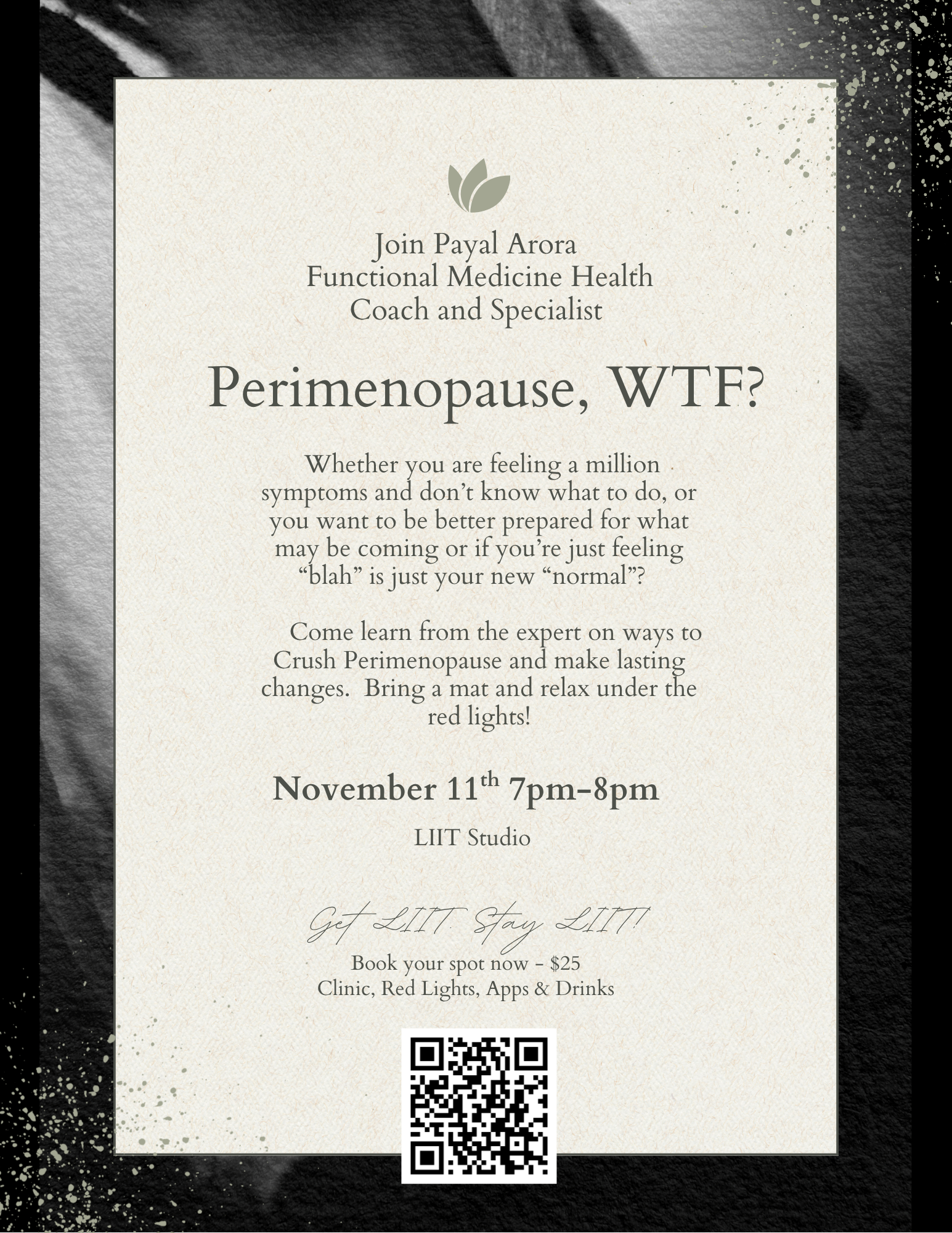 Join Payal Arora, Functional Medicine Health Coach & Perimenopause Specialist in a 1 hour clinic @ LIIT Studio.